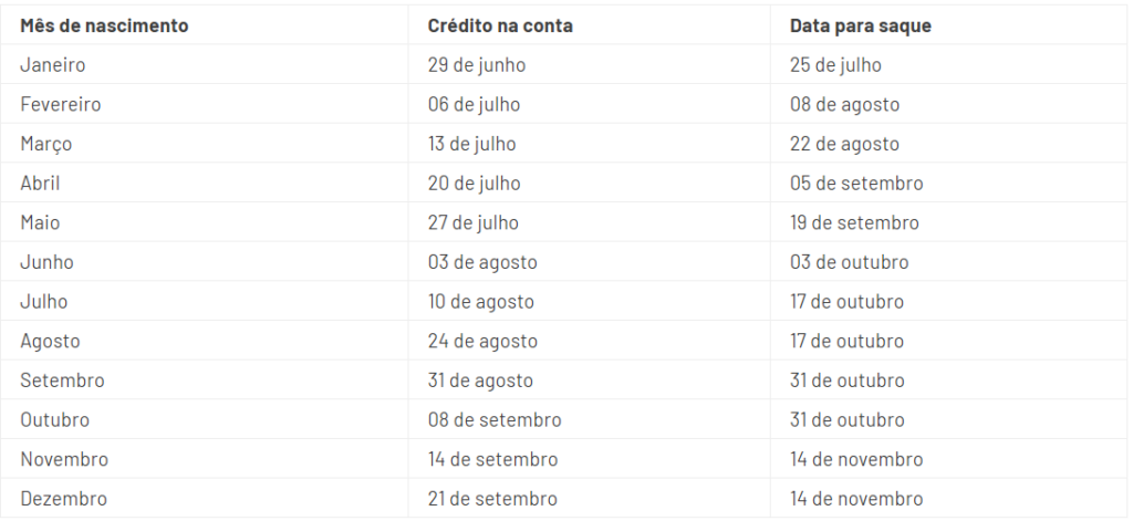O dinheiro só será liberado para saque ou transferência para outra conta bancária a partir de 14 de novembro para os trabalhadores nascidos em dezembro. O calendário de crédito na conta poupança digital e de saques foi estabelecido com base no mês de nascimento do trabalhador.